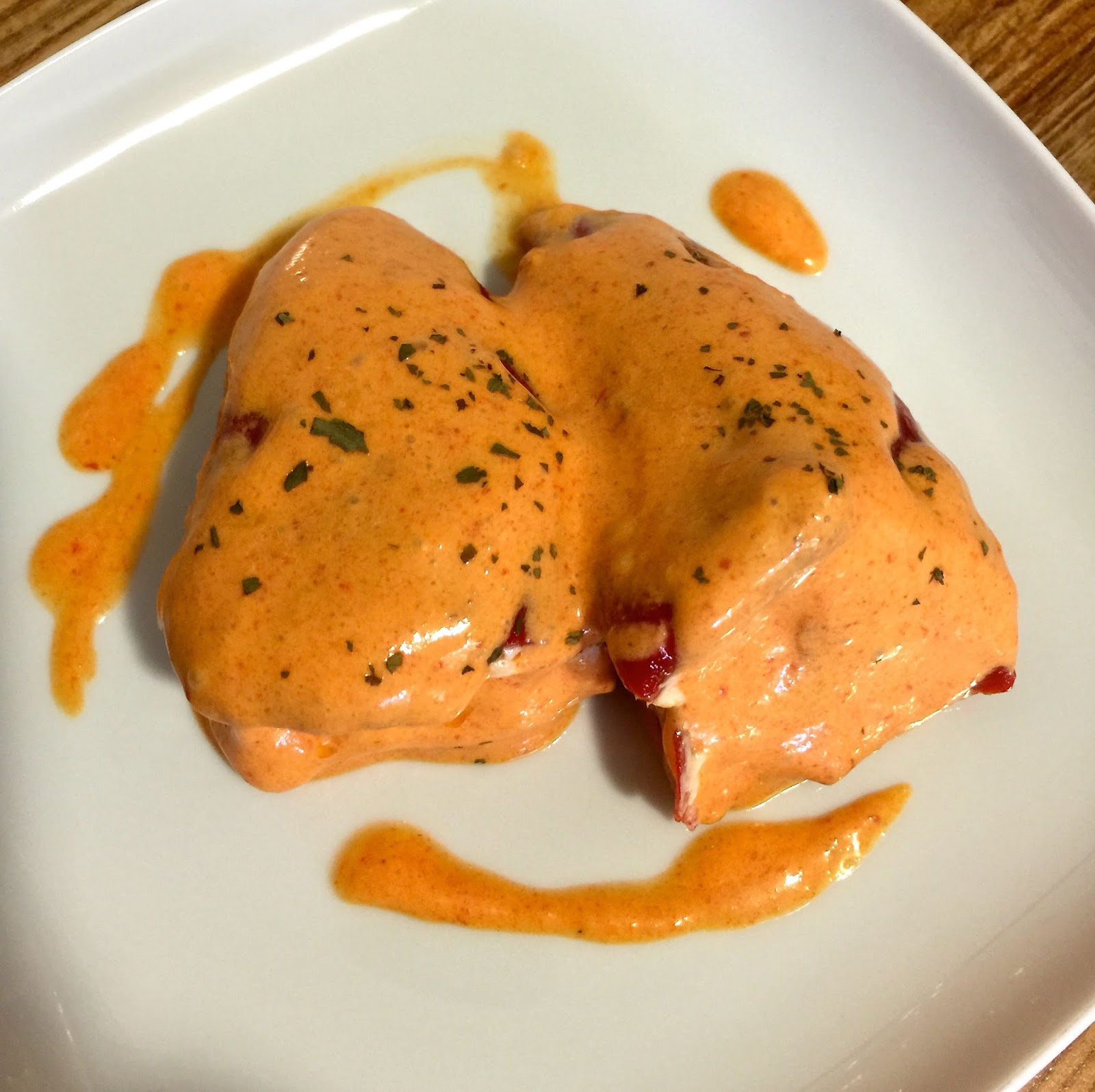 Pimientos del piquillo rellenos de verduras y salsa de queso roquefort
